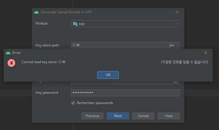 즉, 본 Exception은 릴리즈 서명용 인증서 위치가 이동되어서 발생하는 오류 메시지 입니다.