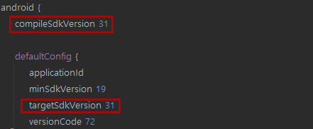 1. app단의 build.gradle에서 compileSdkVersion 31, targetSdkVersion 31 이상으로 변경